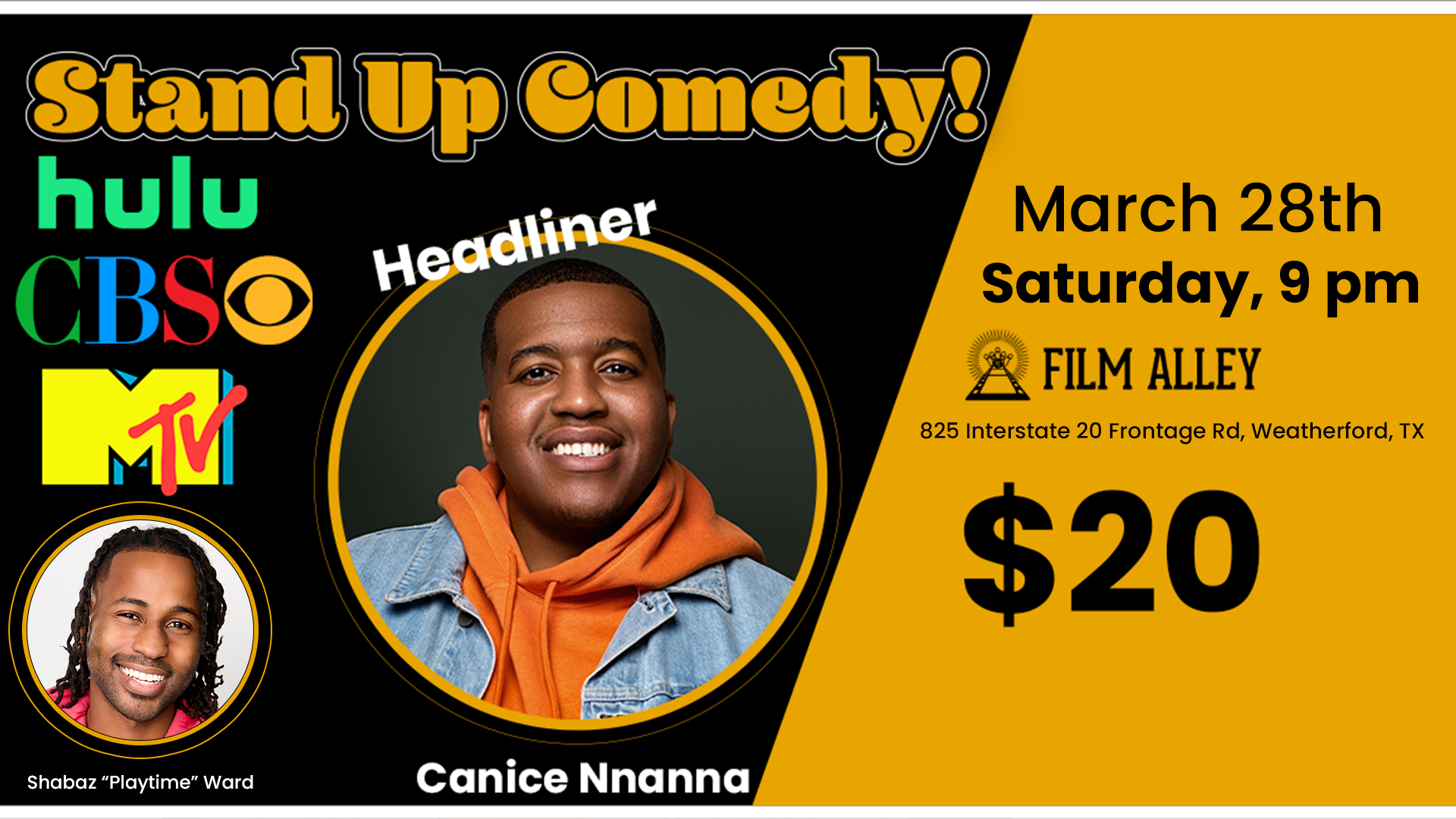 Shabaz “Playtime” Ward is a stand-up comic from Jeanerette, Louisiana, known for his quirky, witty, and high-energy style of comedy. Blending Southern charm with sharp observations and playful storytelling, Shabaz brings an authentic voice to every stage he steps on. With natural charisma and undeniable stage presence, he continues to win over audiences wherever he performs.